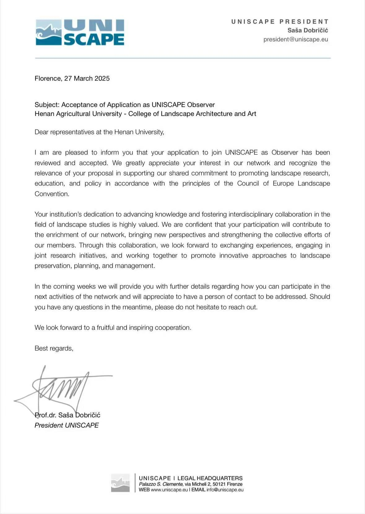 欧洲大学景观联盟(UNISCAPE)是欧洲最具影响力的景观学术组织之一,致力于推动景观保护、规划与管理领域的教育、研究和实践。在我校密切合作伙伴——马尔凯理工大学教授Ernesto Marcheggiani的积极推动下,此次观察员申请于2025年2月正式递出,并在3月底正式达成。欧洲大学景观联盟(UNISCAPE)主席Saša Dobričić教授在信中表示期待通过合作促进跨学科交流,共同探索景观可持续发展的创新路径。双方将在未来几周讨论正式合作的相关议题。